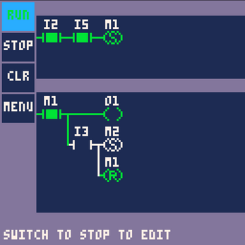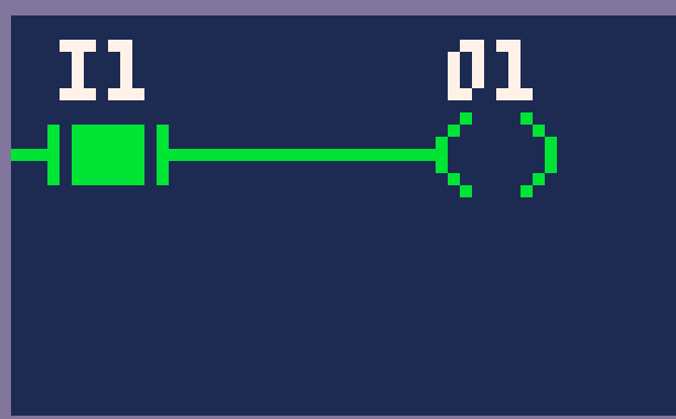 The contacts and coils link to simple bits, variables that can hold a simple true or false value (bool). The game offers 3 types of bits. I type represents and input from outside the theoretical PLC. O type represents an output of the theoretical PLC. M type are internal memory bits that can be used to represent say a step of execution that the plc is in. The program is executed from left to right, top to bottom every frame. The output is updated at the end of the scan.