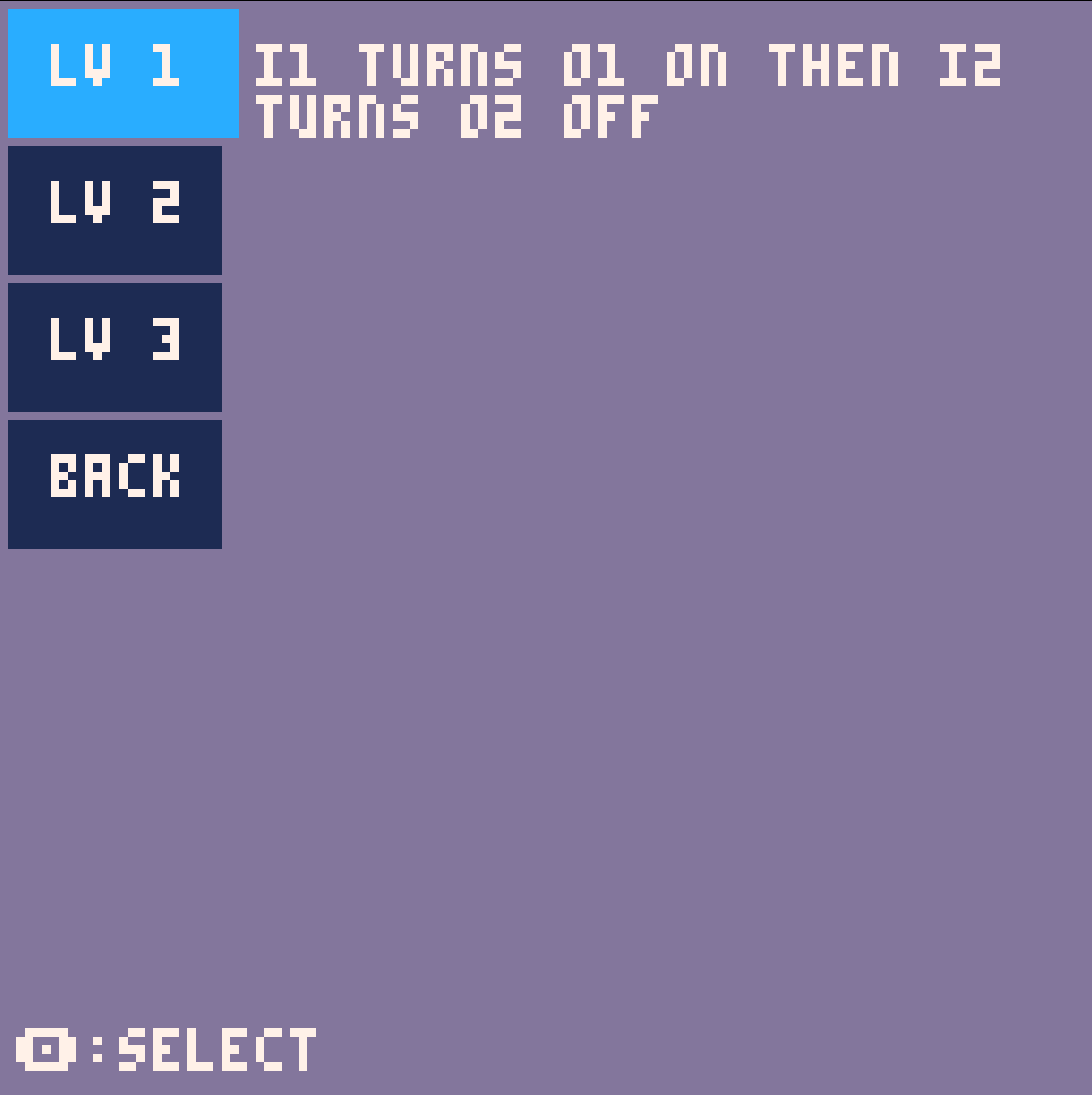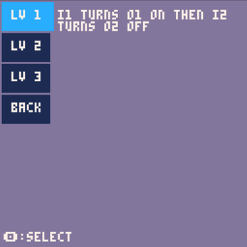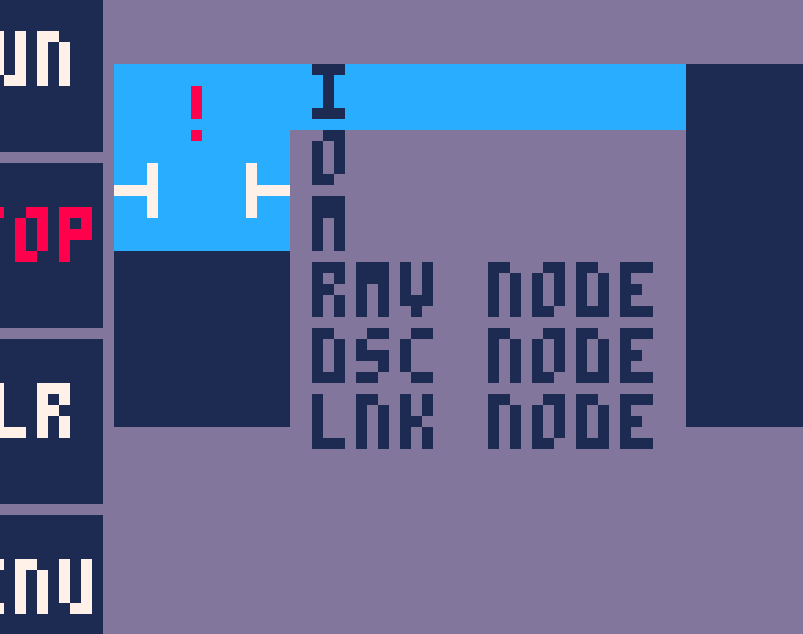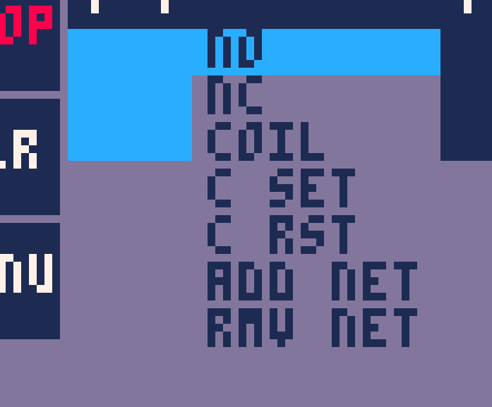 Contact and coil are created using the context menu. The coil context menu is open by navigating with the cursor ( the light blue square) over an empty field and hitting the Pico8 "o" button. Menu is closed by hitting "x".